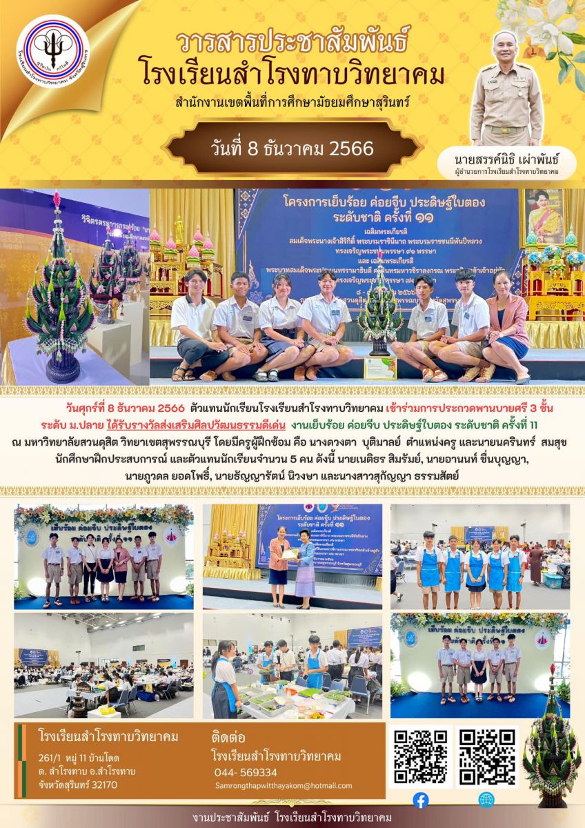 วันศุกร์ที่ 8 ธันวาคม 2566 ตัวแทนนักเรียนโรงเรียนสำโรงทาบวิทยาคม เข้าร่วมการประกวดพานบายศรี 3 ชั้น ระดับ ม.ปลาย ได้รับรางวัลส่งเสริมศิลปวัฒนธรรมดีเด่น งานเย็บร้อย ค่อยจีบ ประดิษฐ์ใบตอง ระดับชาติ ครั้งที่ 11 ณ มหาวิทยาลัยสวนดุสิต วิทยาเขตสุพรรณบุรี ตัวแทนนักเรียนจำนวน 5 คน ดังนี้