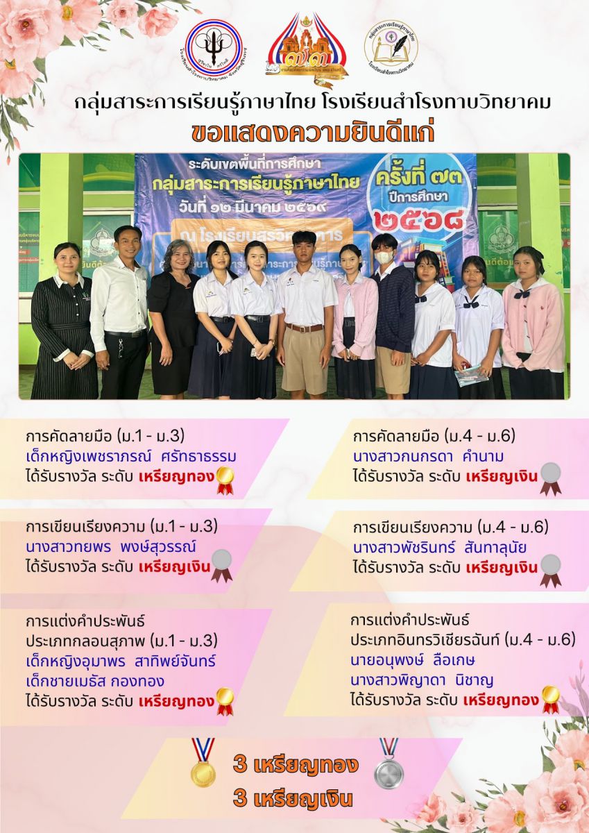 กลุ่มสาระการเรียนรู้ภาษาไทย โรงเรียนสำโรงทาบวิทยาคม ประกาศความสำเร็จครั้งยิ่งใหญ่ในการเป็นตัวแทนสถานศึกษาเข้าร่วมประชันทักษะทางวิชาการและสุนทรียภาพทางภาษา ในงานศิลปหัตถกรรมนักเรียน ระดับมัธยมศึกษา สังกัดสำนักงานเขตพื้นที่การศึกษามัธยมศึกษาสุรินทร์ ครั้งที่ 73 ประจำปีการศึกษา 2568 โดยผลการแข่งขันสะท้อนถึงมาตรฐานการเรียนการสอนที่เป็นเลิศและศักยภาพอันโดดเด่นของผู้เรียน ซึ่งสามารถคว้ารางวัลระดับเหรียญทองมาครองได้ถึง 3 รายการหลัก ได้แก่ รายการคัดลายมือระดับมัธยมศึกษาตอนต้น โดยเด็กหญิงเพชราภรณ์ ศรัทธาธรรม, รายการแต่งคำประพันธ์ประเภทกลอนสุภาพ โดยเด็กหญิงอุมาพร สาทิพย์จันทร์ และเด็กชายเมธัส กองทอง พร้อมด้วยรายการแต่งคำประพันธ์ประเภทอินทรวิเชียรฉันท์ ระดับมัธยมศึกษาตอนปลาย โดยนายอนุพงษ์ ลือเกษ และนางสาวพิญาดา นิชาญ ซึ่งสร้างความภาคภูมิใจและเป็นเกียรติประวัติให้แก่สถานศึกษาอย่างยิ่ง